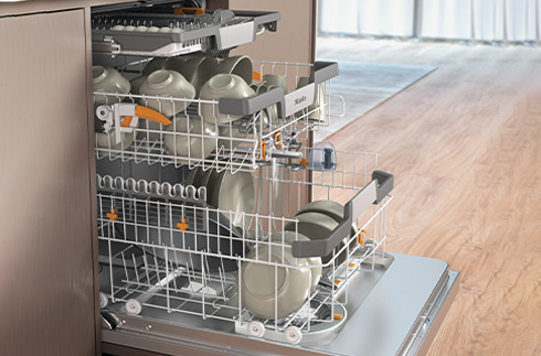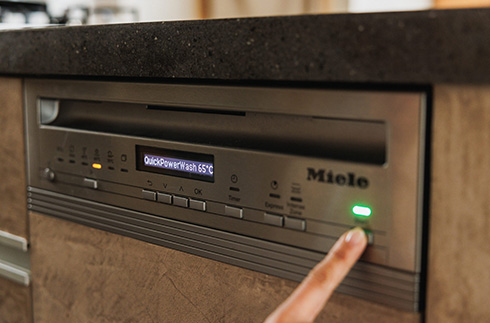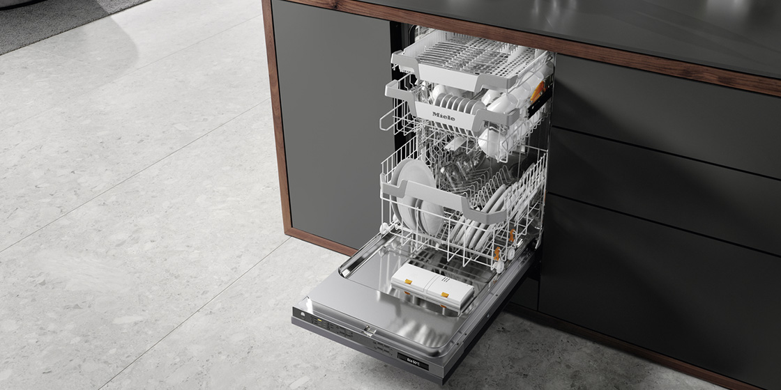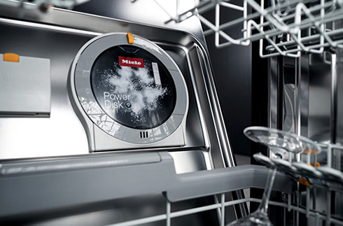 ミーレの自動投入専用洗剤 PowerDisk*をセットすると、プログラムに合わせて最適な量の洗剤を、適切なタイミングで投入。