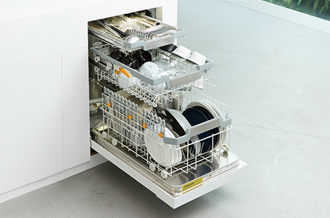 ミーレ食器洗い機のバスケットは、カトラリーなどを置く「MultiFlexトレイ」と、「上段バスケット」「下段バスケット」の3段構成。モデルによって機能が異なります。