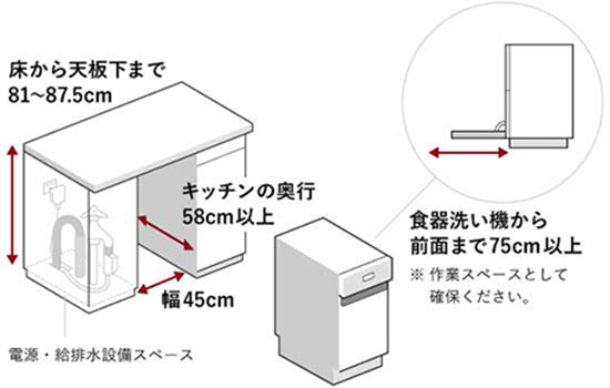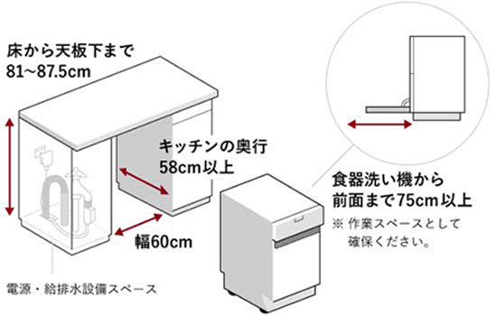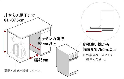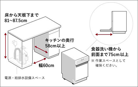 「システムキッチンがある」「設置スペースがある」「200Vの電源を確保できる」「給排水設備がある/工事が可能」といった、4つの設置条件をクリアできれば後付け設置および入れ替えが可能です。