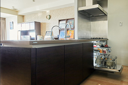 5人家族のYさん。国内メーカーの食器洗い機は小さく感じ、ミーレの幅60cmタイプを選択。食器のほか、まな板やフライパンなど調理機器も1日に1回、まとめ洗いしているのだそう。